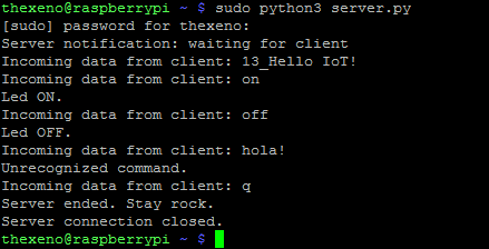 while 1: cmd = 0 mex = receive_sck(clientsocket) # lettura comandi veri try: mex = fine_data(mex) print(&amp;amp;quot;Incoming data from client: &amp;amp;quot; + mex) if mex=='on': msg = 'Led ON.' msg = msg_len(msg) send_sck(clientsocket, msg) cmd = 1 GPIO.output(3, 1) if mex=='off': msg = 'Led OFF.' msg = msg_len(msg) send_sck(clientsocket, msg) cmd = 1 GPIO.output(3, 0) if mex=='q': #print(&amp;amp;quot;Incoming data from client: &amp;amp;quot; + mex) msg = &amp;amp;quot;Server ended. Stay rock.&amp;amp;quot; cmd = 1 msg = msg_len(msg) send_sck(clientsocket, msg) GPIO.output(3, 0) break; except: print(&amp;amp;quot;Uncorrect format received&amp;amp;quot;) if cmd == 0: # is still zero msg = 'Unrecognized command.' msg = msg_len(msg) send_sck(clientsocket, msg) server.close() print(&amp;amp;quot;Server connection closed.&amp;amp;quot;)